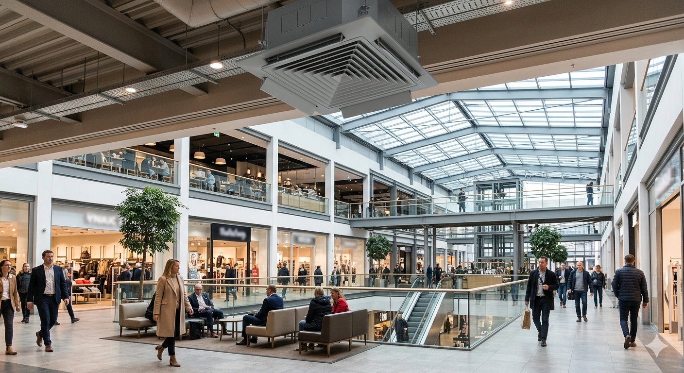 门面房、挑高仓库或开放式店面普遍存在空间跨度大、密封性差的问题。传统空调风量不足,冷气难以覆盖远端死角,导致靠近内机的地方冻得难受,远离内机的地方热气腾腾。在大空间内,冷热对流缓慢,往往需要漫长的预冷时间才能达到体感舒适温度,极大影响了经营效率。